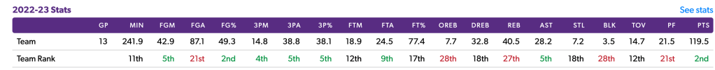 In the offseason, it was very clear what this team had to fix: Fox and Sabonis are great players the rely heavily on attacking the paint. The Kings had only one above average 3 point shooter on the roster in the Post-Sabonis trade 2021-22 season, that being Harrison Barnes. So, how to you fix this? Draft Keegan Murray, sign Malik Monk, trade for Kevin Huerter. Boom. Now the Kings starting line-up surrounds Fox and Sabonis with elite (well HB has been shit so far but he’s getting better) shooters that frees them up to dominate inside. Thus far, the results speak for themselves. The Kings are 2nd(!!) in the league in Offensive Rating and points per game, 5th in assists per game, 3 point attempts, AND 3 pointers made (all stats of 11/26/22). The offense is firing on all cylinders, and it’s so much fun to watch. Running through Sabonis with a million DHO (dribble handoffs) actions and smart cutters around it makes for some beautiful basketball.